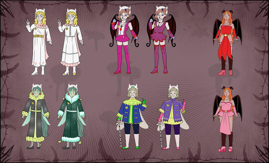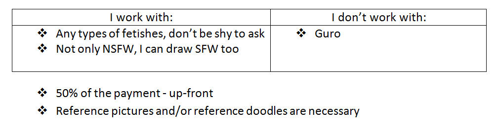 | Coloured + flat shadow | 20$ | + 1 character = double the pric. Simple background + +6$. Detailed background = + 20$ |